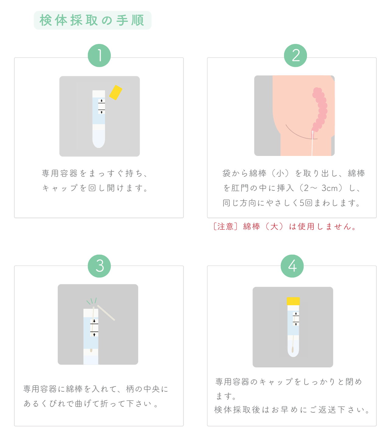 商品の中には、検査申込書、検査の手順書、検査用の綿棒、スピッツ(検査容器)、検体提出用のレターパックが同梱されております。